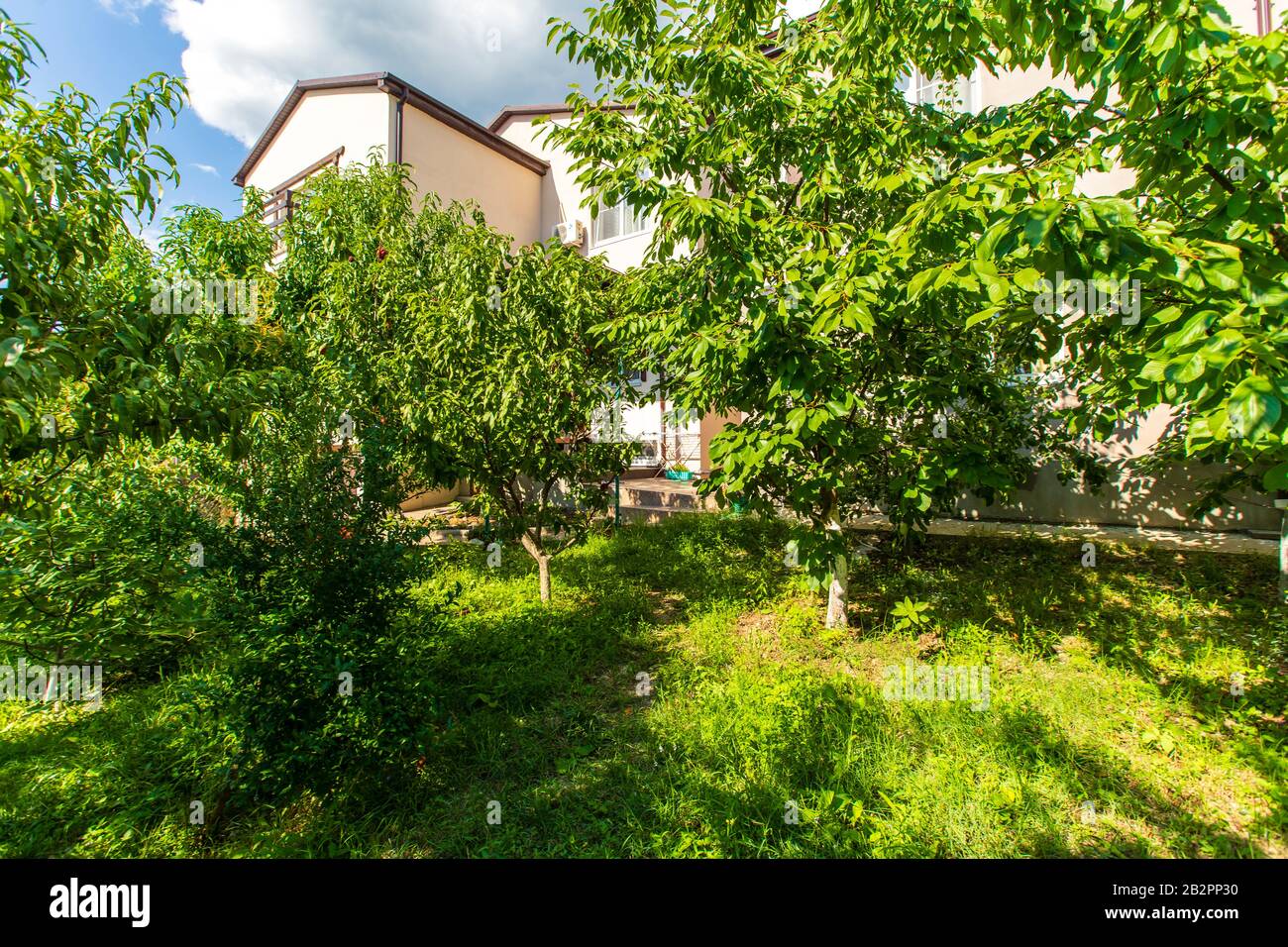 Green Lawn With Fruit Trees In The Backyard Of The House Against
