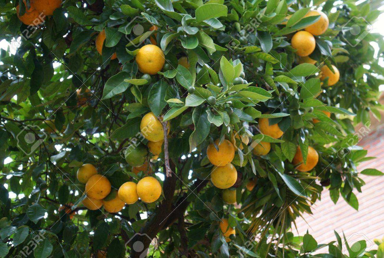 Hybrid Tree Growing Oranges And Lemons Hybrid Fruit Tree Against