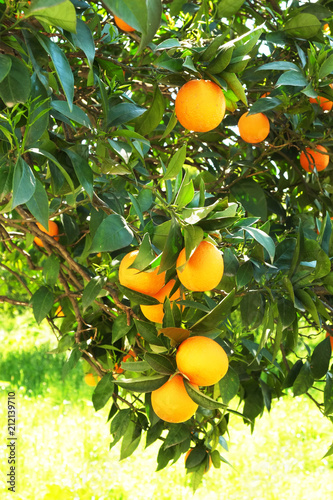 Close Up Of Multiple Organic Ripe Perfect Orange Fruits Hanging On