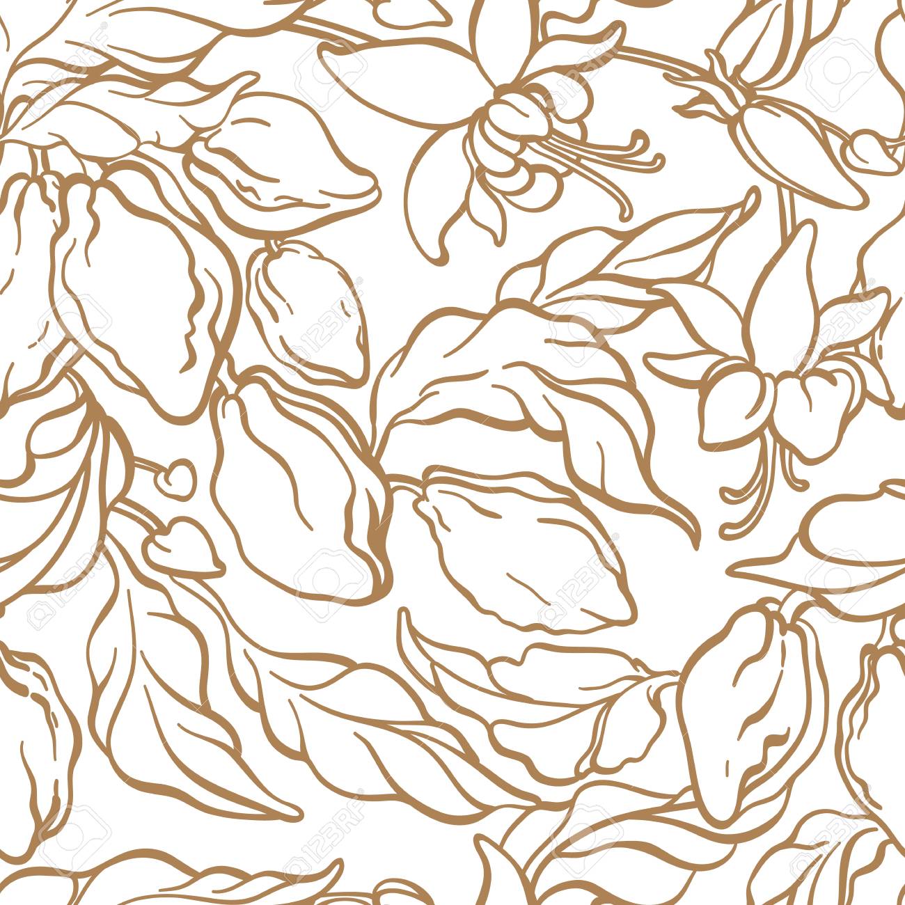 Vector Seamless Pattern Of Cocoa Tree With Leaf Bean Flower