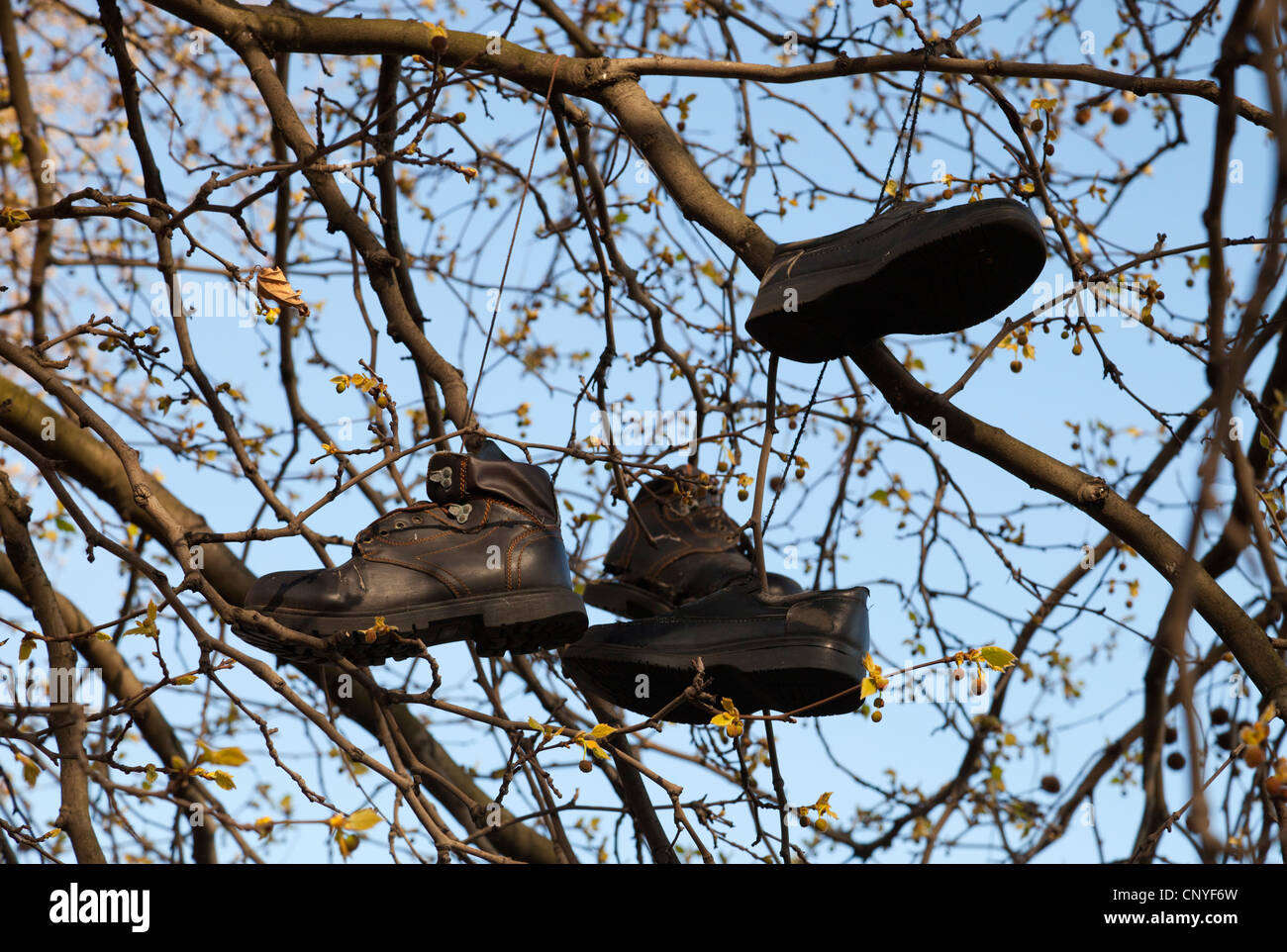 Strange Fruit Boots Hanging In A Tree On Millbank London Stock