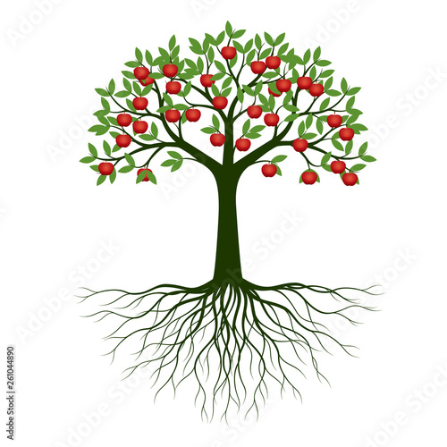 Green Summer Tree With Root And Red Apple Fruits Vector Image