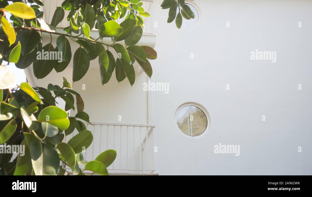 Green Leaves Of A Tropical Tree And The Facade Of A White Building