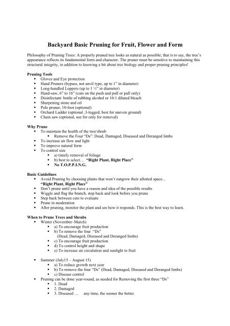 Includes 17 figures that illustrate various techniques. As arborist we are asked often when the best time to prune trees is. Initial fruit tree pruning is important to help young trees produce thick stems and open canopies where light and air can enter and promote flowering as well as reduce fungal and bacterial diseases.