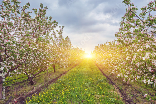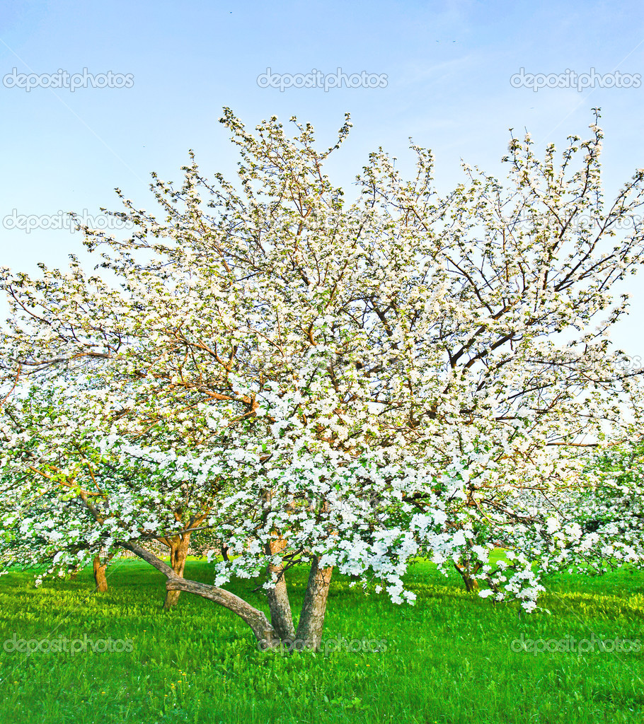 Beautiful Blooming Of Decorative White Apple And Fruit Trees Ove