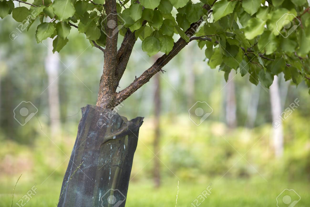 Close Up Of Young Green Fruit Tree Sapling Trunk With Plastic