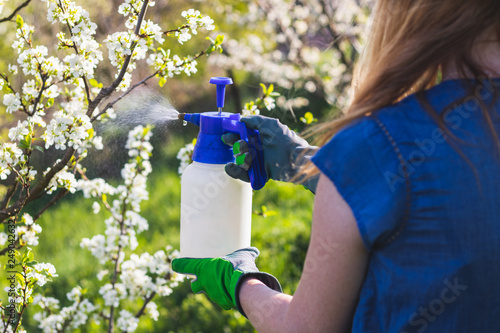 Farmer With Gardening Glove Spraying A Blooming Fruit Tree Against