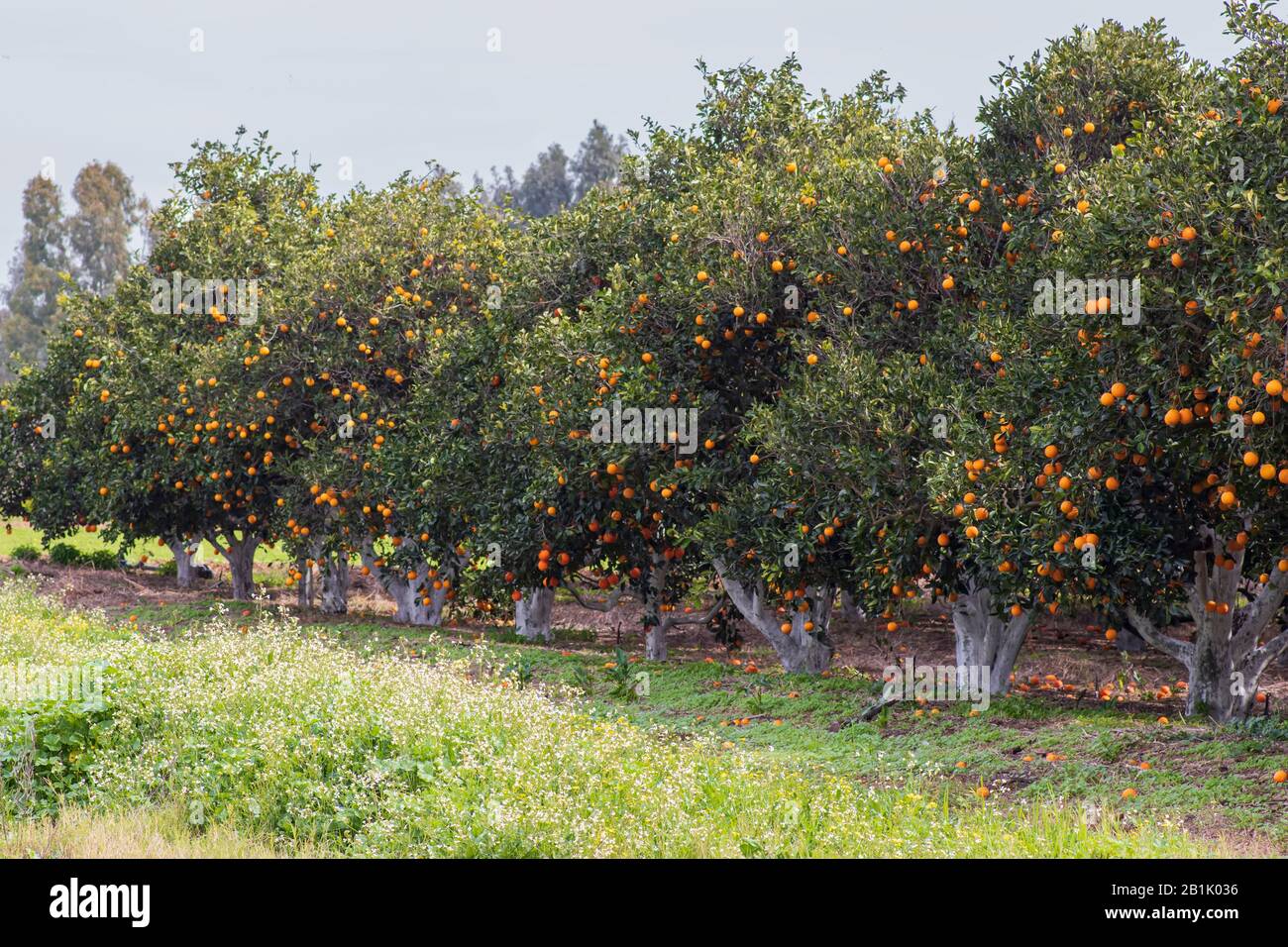 Rows Of Orange Trees With Ripe Fruits On The Branches In A Citrus