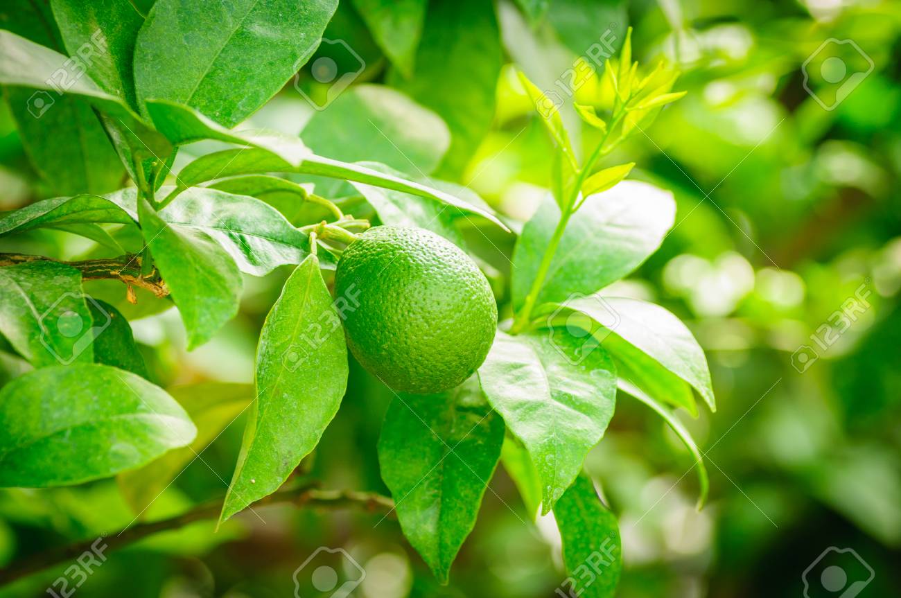 Small Green Citrus Fruit On Tree With Green Leaves In Sunshine