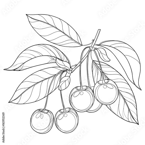 Vector Branch With Outline Ripe Cherry Bunch Berry And Leaves In