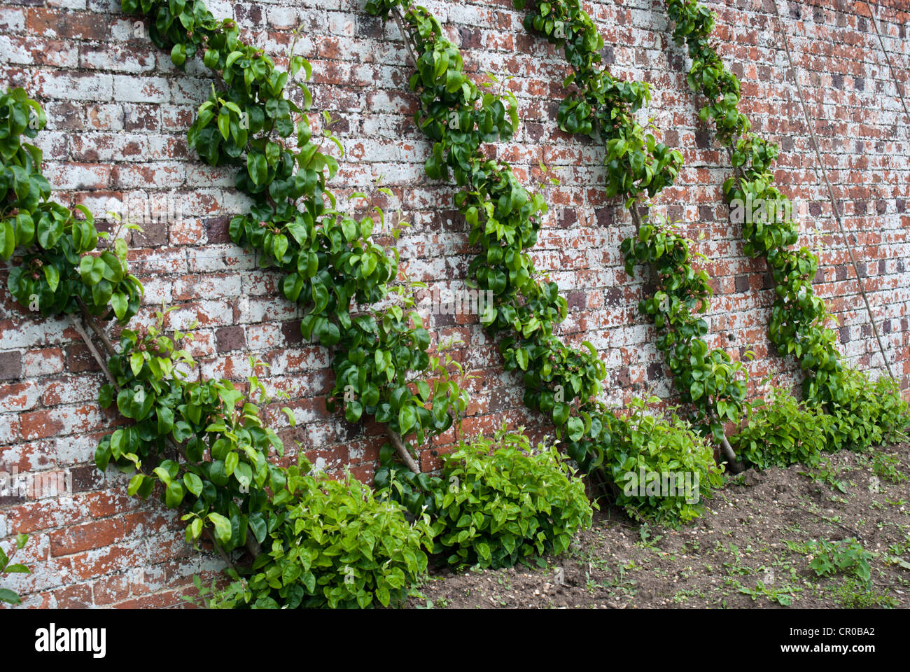 Cordon Apple Tree Growing In A Country Walled Garden Stock Photo