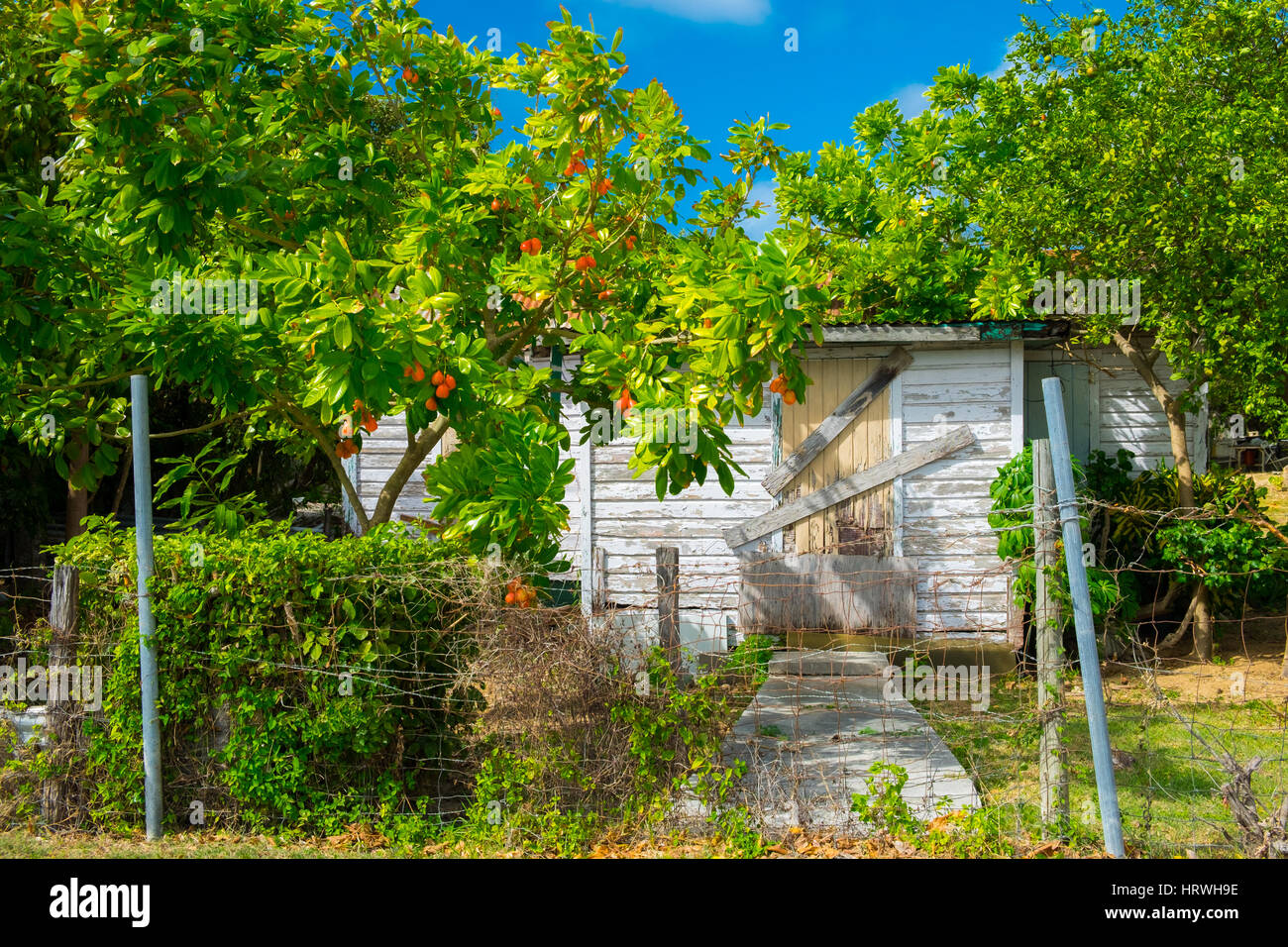 Abandoned Wooden House Shed In A Garden With Fruit Trees In The