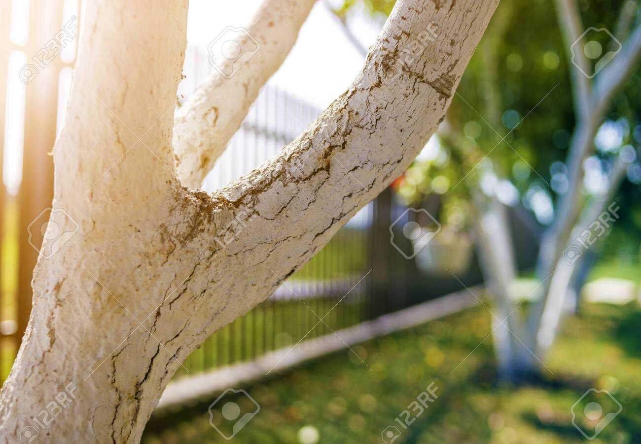 Whitewashed Bark Of Fruit Trees Growing In Sunny Orchard Garden On