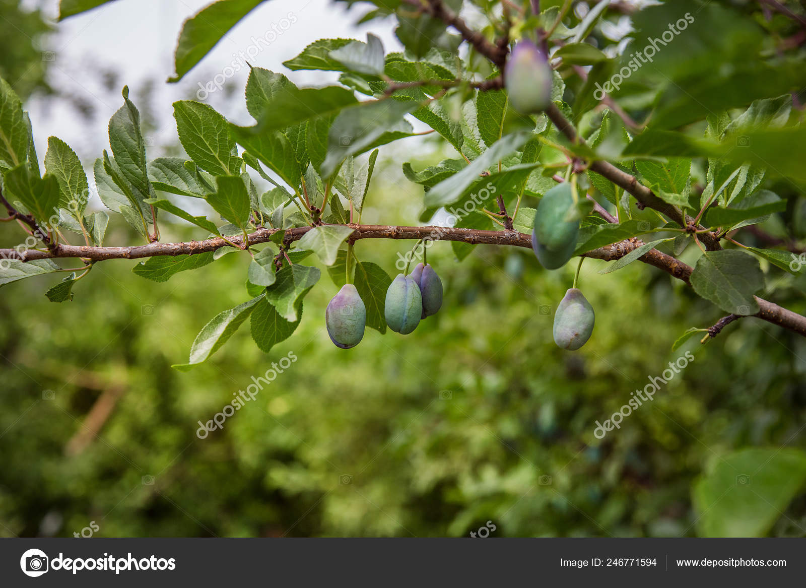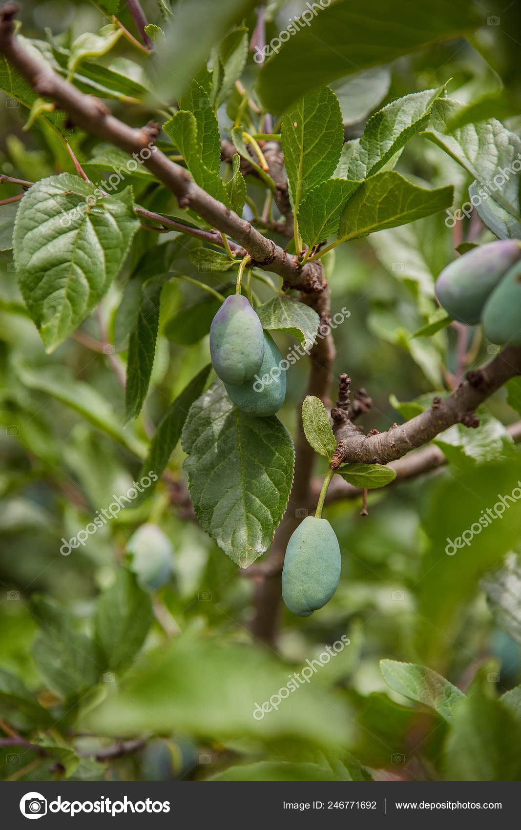 Young Green Fruits Plums Hang Tree Branch Growing Organic Fruit