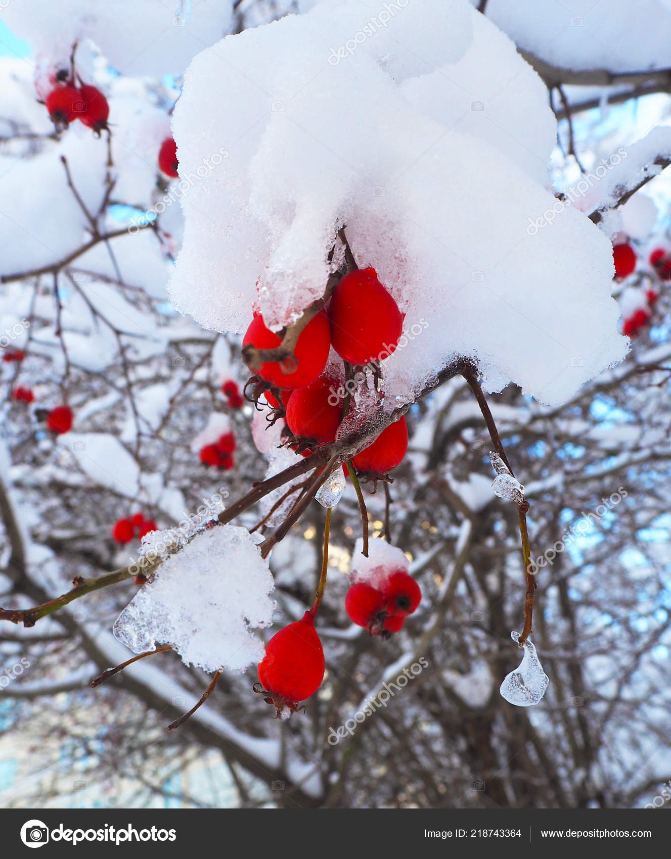 Hawthorn Berries Branches Winter Tree Covered Snow Ice Close