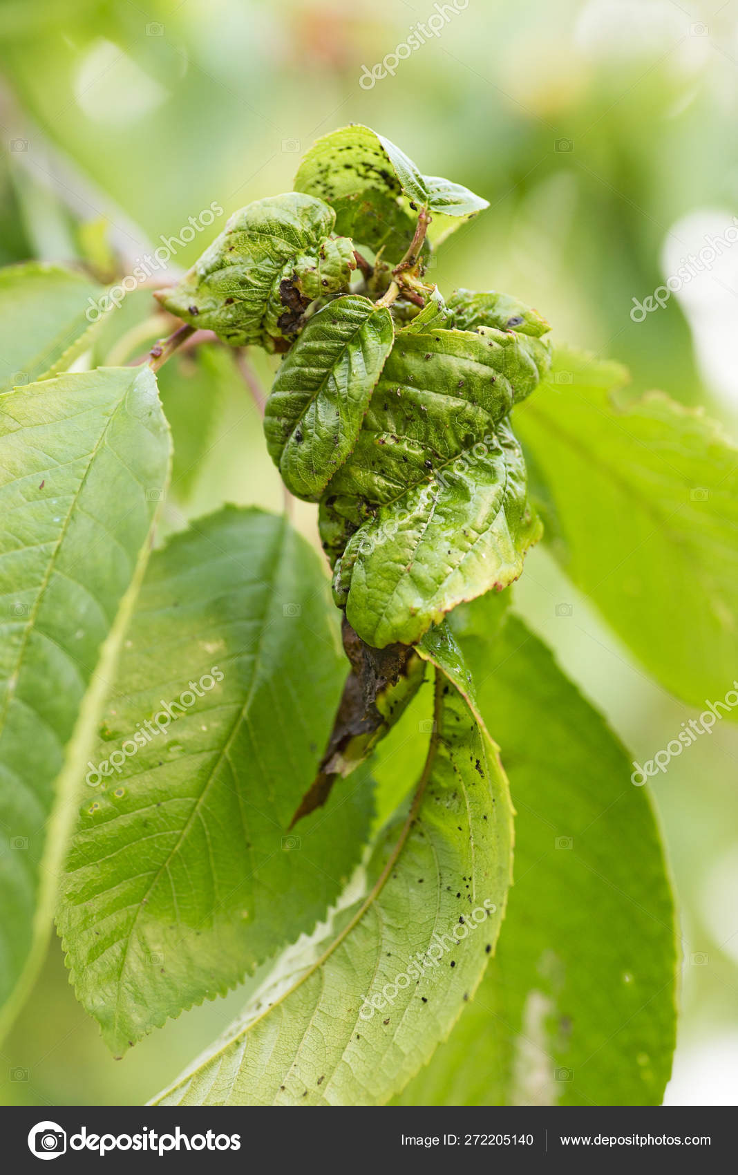 Branch Of Fruit Tree With Wrinkled Leaves Affected By Black Aphid