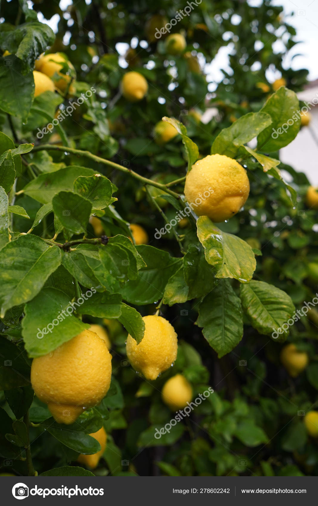 Lemon Fruits Drops Rain Weigh Branch Ripe Lemons Hanging Tree
