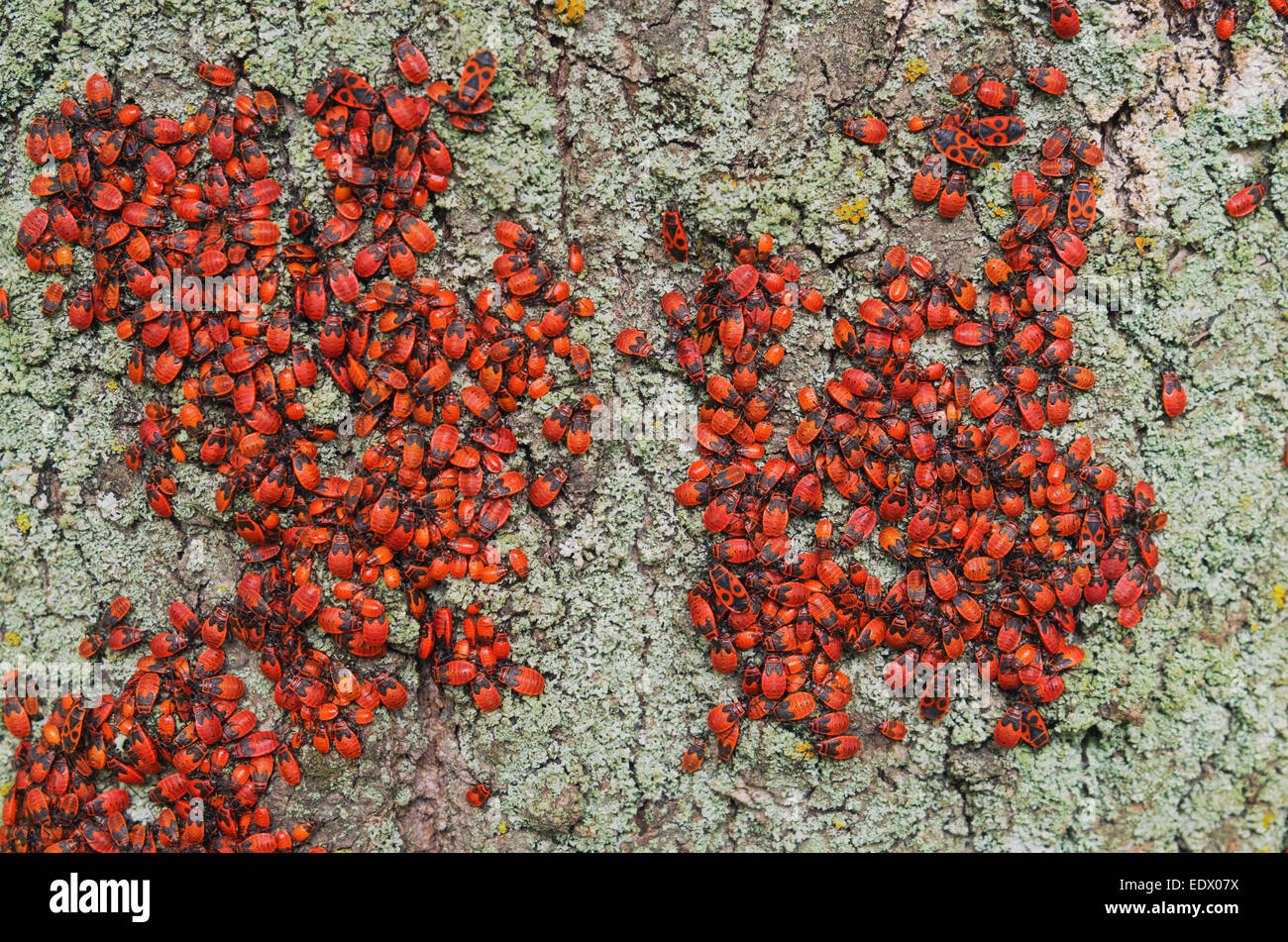 Group Of Insects A Red Black Forest Firebug On Tree Bark Stock