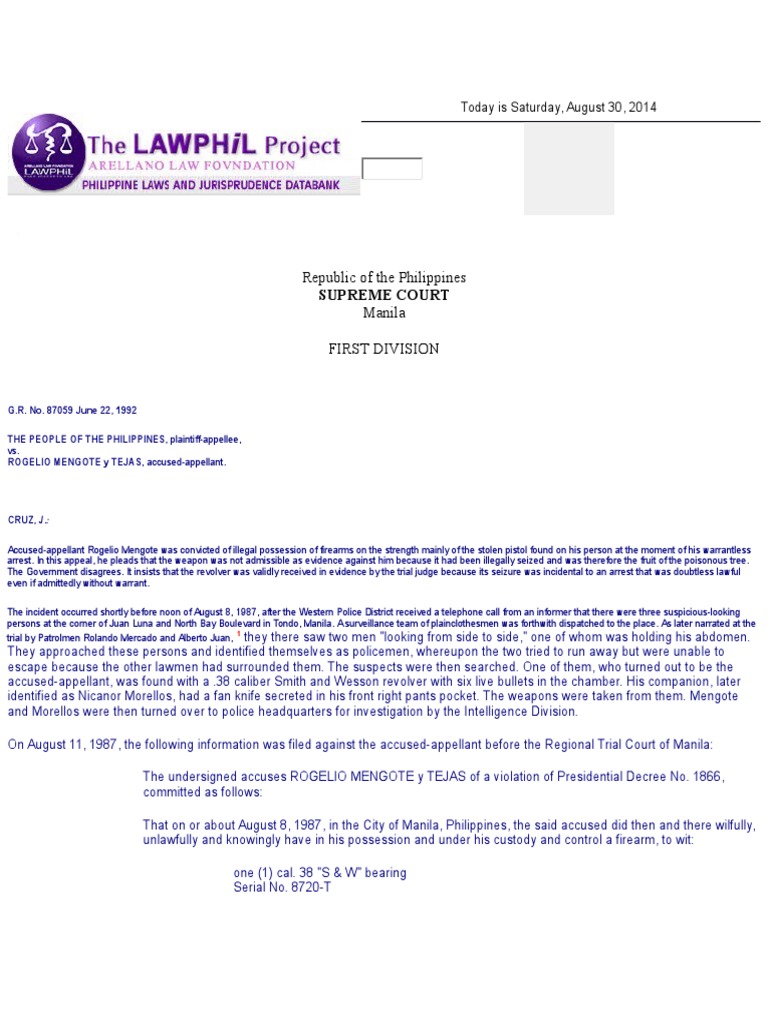 Invalid Arrest People Vs Mengote Search And Seizure Search