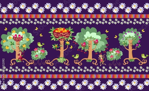 Beautiful Seamless Striped Pattern With Cute Cartoon Fruit Trees