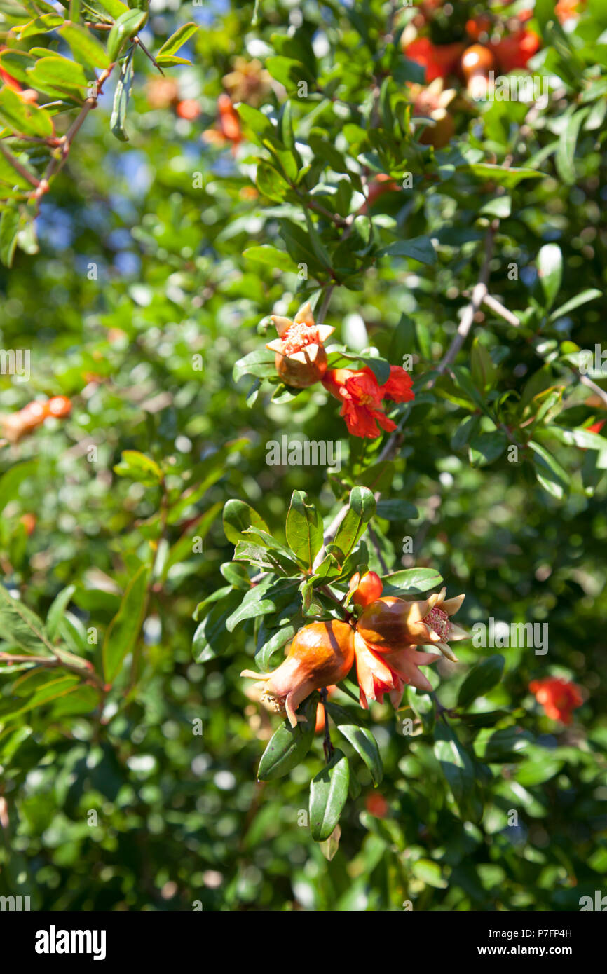 Blooming Pomegranate Tree With Small Red Fruits And Flowers Bees